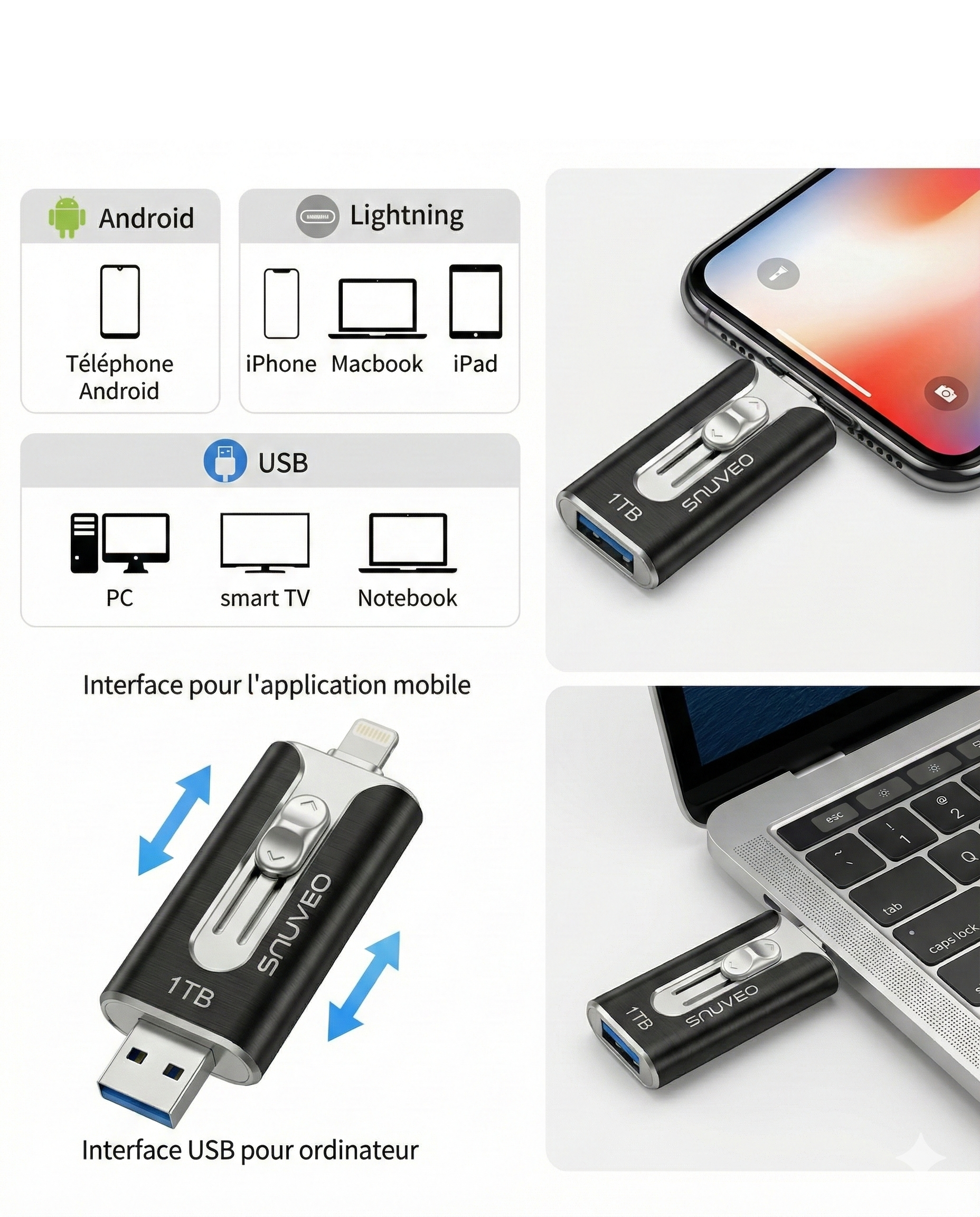 Oui. Sauveo est universelle. Elle fonctionne avec les iPhone, iPad (Lightning et USB-C), les téléphones et tablettes Android, ainsi que les ordinateurs Mac et Windows. Aucun câble spécial ni étape compliquée n'est requis.